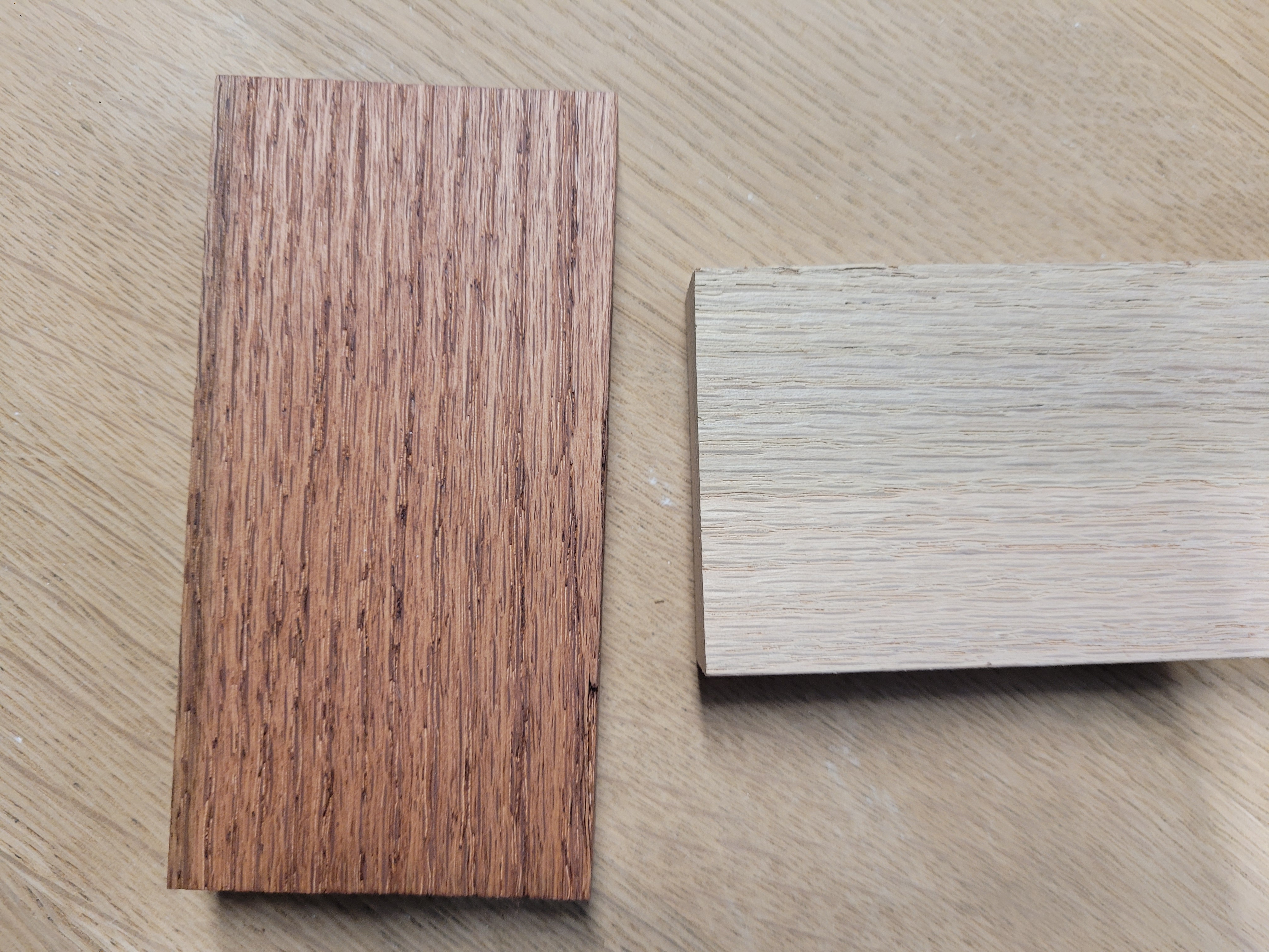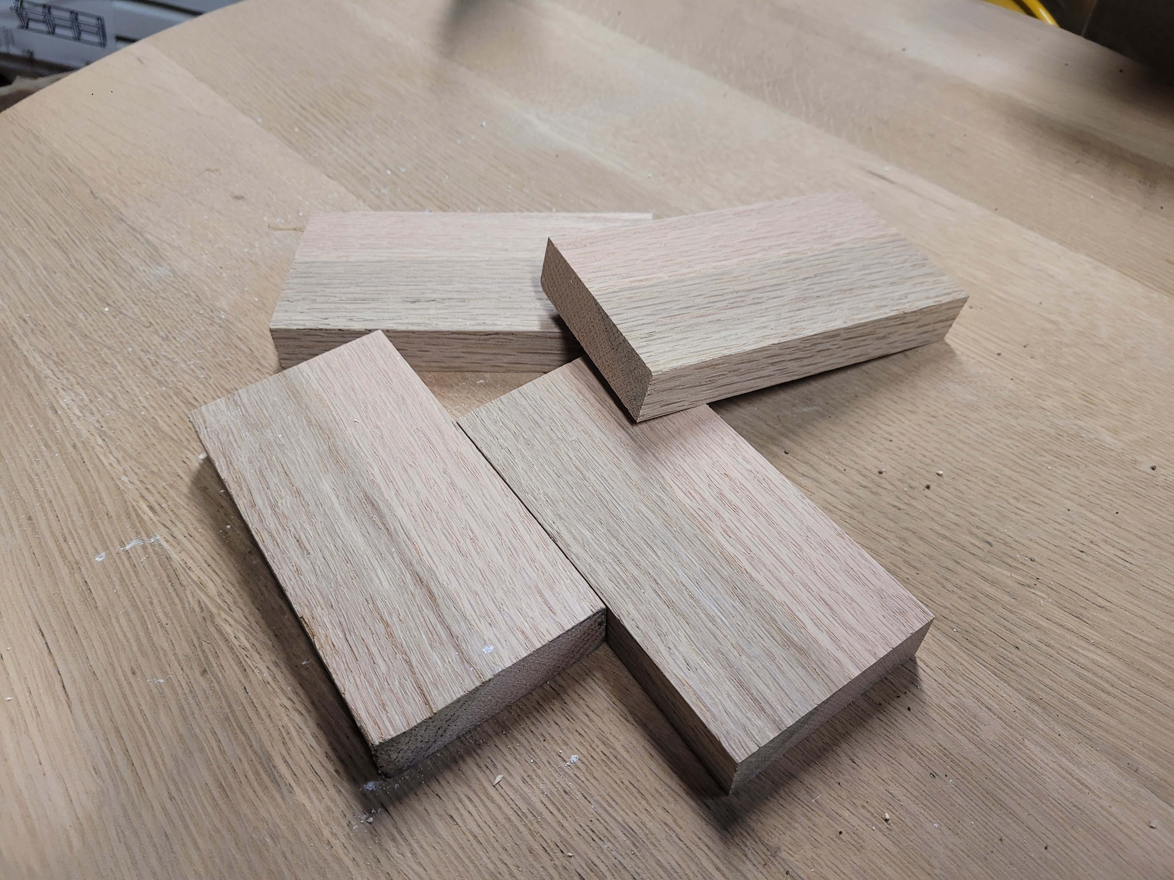 We decided to finish the Red Oak with an oil-based Varathane stain called "Honey", but we also wanted to retain some of the rough surface finish of the Red Oak, so we needed to experiment with an application of the stain to the wood. So we cut some 4" lengths to use as test-pieces.